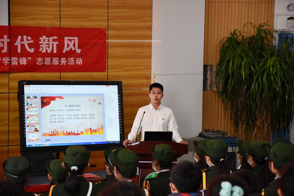 在宣讲中,队员李淏涵身着国旗护卫队橄榄绿正装,用视频播放、PPT讲解、提问互动的形式,从“知雷锋生平、讲雷锋故事、传雷锋精神”三个方面进行了深入浅出地讲解,全面详细地解读了雷锋同志平凡而伟大的一生。李淏涵在向小朋友讲述雷锋故事时,生动形象地把“雷锋图书馆”“勤劳的公务员”“小小拖拉机手”这些耳熟能详、广泛流传的雷锋小故事讲给同学们听。