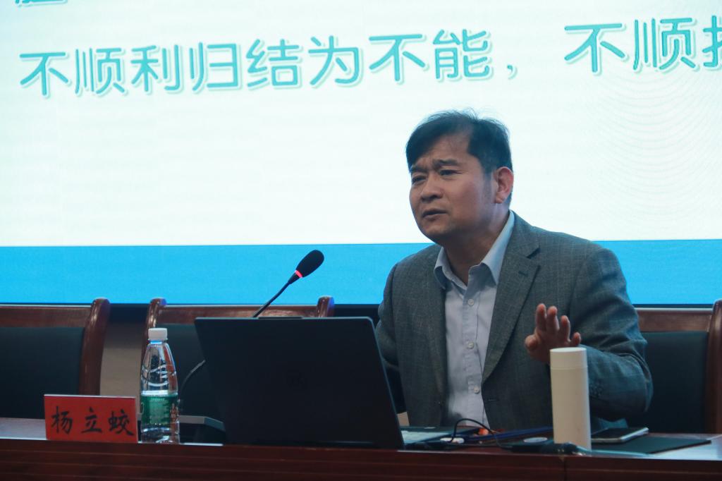 杨立蛟教授阐述了固定性思维与成长性思维的定义,他强调,中华传统文化传承和弘扬的关键在于培养大学生的成长性思维。杨教授从名人事例着眼,通过讲述俞敏洪、刘强东、李强等名人事迹正面论述了成长性思维的重要意义。杨教授还引经据典,引用中国古代名人轶事,从老子的《道德经》出发,展开叙述了中国古代文化中的固定性思维与成长性思维。杨教授从发人深省的故事入手,立足于自己以及同学们的日常生活小处,以朴实易懂的语言设身处地地为同学们进行详细的讲解,讲解的同时,他还为同学们播放了几则饱含深厚哲理的视频以辅助同学理解中华传统文化。最后,杨立蛟教授对同学们寄予厚望,希望同学们多阅读经典书籍,培养成长性思维,开阔眼界、增长知识。