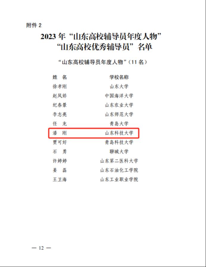 近日,中共山东省委教育工委公布2023年“山东高校辅导员年度人物”评选结果,安全学院辅导员潘刚获评“山东高校辅导员年度人物”荣誉称号。