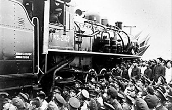 铁道部青岛四方铁路工厂职工欢送新中国第一个火车头“八一”号开出厂房